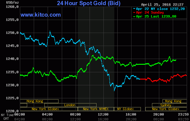 Chốt phiên giao dịch đầu tuần (Thứ Hai ngày 25/04), giá vàng giao tháng Sáu trên sàn Comex tại Sở giao dịch New York Mercantile đảo chiều bật mạnh $10,20 (+0,8%) lên đóng cửa ở $1.240,20/oz.