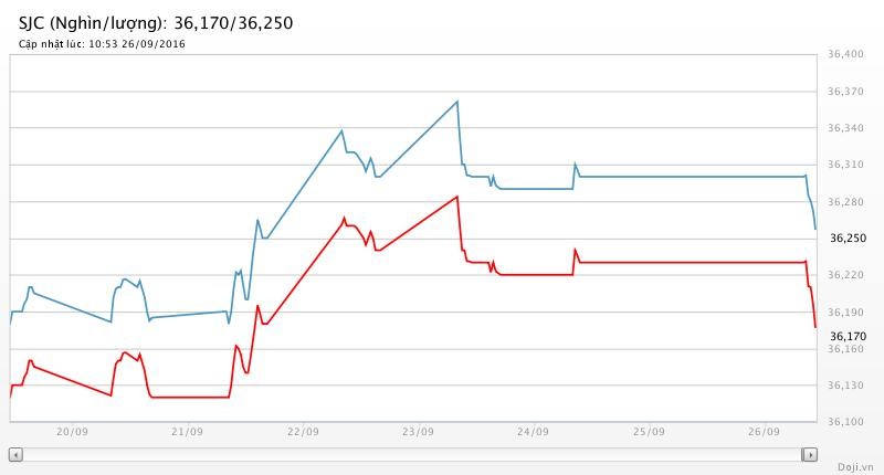 Tương tự, tại các đại lý của Doji, giá vàng miếng SJC cũng được Tập đoàn điều chỉnh giảm 60 nghìn đồng mỗi lượng chiều mua và 50 nghìn đồng mỗi lượng chiều bán về yết ở 36,17 – 36,25 triệu đồng/lượng (MV-BR) đối với giao dịch lẻ; và đắt hơn 10 nghìn đồng chiều mua, đồng thời rẻ hơn 10 nghìn đồng chiều bán đối với giao dịch buôn ở thị trường Hà Nội. Hiện, doãng chênh lệch 2 chiều mua - bán ở Doji là 80 nghìn đồng/lượng.