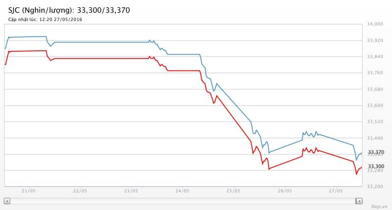 Tương tự, tại các đại lý của Doji, giá vàng miếng SJC cũng được Tập đoàn điều chỉnh lùi 80 nghìn đồng chiều mua và 90 nghìn đồng chiều bán xuống yết ở 33,30 – 33,37 triệu đồng/lượng (MV-BR) đối với giao dịch lẻ; và đắt hơn 10 nghìn đồng chiều mua, đồng thời rẻ hơn 10 nghìn đồng chiều bán đối với giao dịch buôn ở thị trường Hà Nội. Hiện, doãng chênh lệch 2 chiều mua - bán ở Doji là 70 nghìn đồng/lượng.
