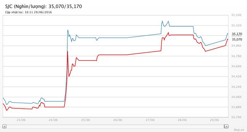 Tương tự, tại các đại lý của Doji, giá vàng miếng SJC cũng được Tập đoàn điều chỉnh tăng 210 nghìn đồng mỗi chiều lên yết ở 35,07 – 35,17 triệu đồng/lượng (MV-BR) đối với giao dịch lẻ; và đắt hơn 10 nghìn đồng chiều mua, đồng thời rẻ hơn 10 nghìn đồng chiều bán đối với giao dịch buôn ở thị trường Hà Nội. Hiện, doãng chênh lệch 2 chiều mua - bán ở Doji là 100 nghìn đồng/lượng.