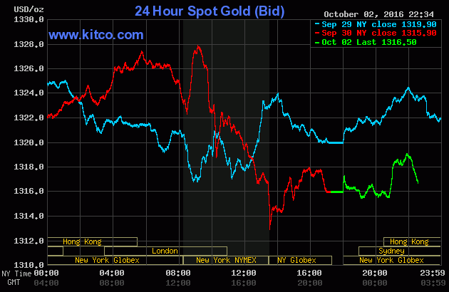 Chốt phiên giao dịch cuối tuần trước (Thứ Sáu ngày 30/09), giá vàng giao tháng Mười hai trên sàn Comex tại Sở giao dịch New York Mercantile trượt sâu $8,90 (-0,7%) xuống đóng cửa ở $1.317,10/oz. Tuy nhiên, tính chung trong cả tháng Chín, giá kim loại quý này nhích nhẹ 0,4%, tương ứng tăng 0,3% trong cả Quý III/2016, căn cứ theo dữ liệu của FactSet.