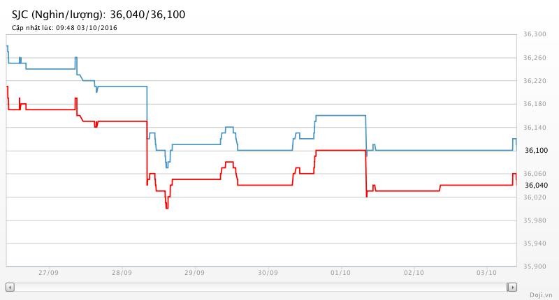 Trong khi, tại các đại lý của Doji, giá vàng miếng SJC cũng được Tập đoàn điều chỉnh nhích không đáng kể 10 nghìn đồng mỗi lượng lên yết ở 36,05 – 36,11 triệu đồng/lượng (MV-BR) đối với giao dịch lẻ; và đắt hơn 10 nghìn đồng chiều mua, đồng thời rẻ hơn 10 nghìn đồng chiều bán đối với giao dịch buôn ở thị trường Hà Nội. Hiện, doãng chênh lệch 2 chiều mua - bán ở Doji là 60 nghìn đồng/lượng.