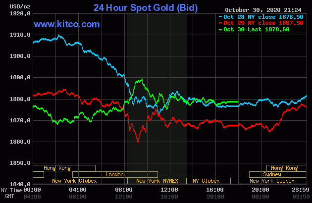 Trên Kitco.com, kết phiên giao dịch cuối tuần, giá vàng giao ngay được giao dịch ở mức 1.878,6 USD/ounce, tăng hơn 11 USD/ounce so với giá kết phiên giao dịch gần nhất. Giá vàng giao tháng 12/2020 trên sàn Comex New York giao dịch ở mức 1.878,5 USD/ounce.