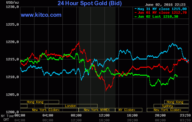 Chốt phiên giao dịch Thứ Năm (ngày 03/06), giá vàng giao tháng Sáu trên sàn Comex tại Sở giao dịch New York Mercantile giảm nhẹ $2,10 (-0,2%) xuống đóng cửa ở $1.209,80/oz; khoét đáy kể từ ngày 16/2, theo số liệu của FactSet. Trong khi, giá bạc giao Tháng Bảy lại nhích 10 cents (+0,6%), lên đứng ở $16,03/oz.