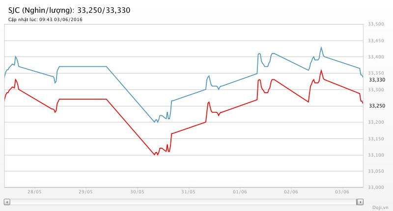 Tương tự, tại các đại lý của Doji, giá vàng miếng SJC cũng được Tập đoàn điều chỉnh hạ 80 nghìn đồng chiều mua và 70 nghìn đồng chiều bán xuống yết ở 33,25 – 33,33 triệu đồng/lượng (MV-BR) đối với giao dịch lẻ; và đắt hơn 10 nghìn đồng chiều mua, đồng thời rẻ hơn 10 nghìn đồng chiều bán đối với giao dịch buôn ở thị trường Hà Nội. Hiện, doãng chênh lệch 2 chiều mua - bán ở Doji là 80 nghìn đồng/lượng.