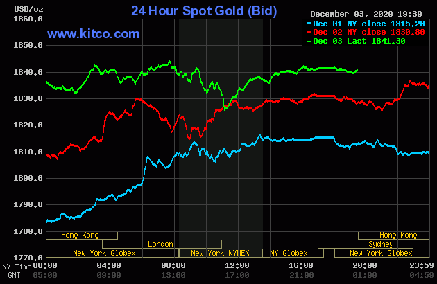 Trên Kitco.com, tại thời điểm 7h30 sáng ngày hôm nay 4/12 (theo giờ Việt Nam), giá vàng giao ngay được giao dịch ở mức 1.841 USD/ounce, tăng 10 USD so với giá kết phiên giao dịch gần nhất. Giá vàng giao tháng 12/2021 trên sàn Comex New York được giao dịch ở mức 1.852 USD/ounce.