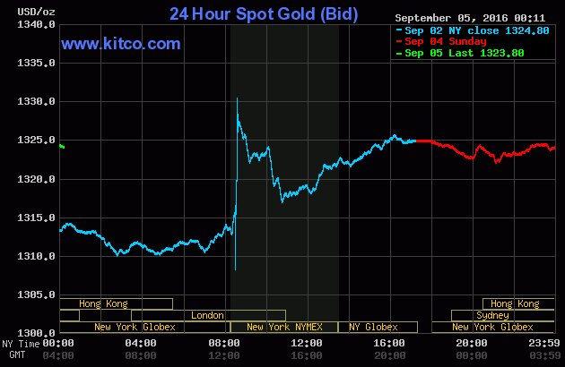 Chốt phiên giao dịch cuối tuần trước (Thứ Sáu ngày 02/09), giá vàng giao tháng 12 trên sàn Comex tại Sở giao dịch New York Mercantile bật mạnh $9,60 (+0,7%) lên đóng cửa ở $1.326,70/oz, thoát đáy hai tháng được lập vào Thứ Tư trước đó. Tuy nhiên, tính chung cả tuần, giá kim loại quý này vẫn trôi nhẹ 0,1% - căn cứ theo dữ liệu của FactSet.
