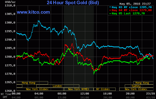 Chốt phiên giao dịch Thứ Năm (ngày 05/05), giá vàng giao tháng Sáu trên sàn Comex tại Sở giao dịch New York Mercantile giảm tiếp $2,10 (-0,2%) xuống đóng cửa ở $1.272,30/oz, đánh dấu phiên giảm thứ 3 liên tiếp sau chuỗi 7 phiên tăng liên tiếp trước đó.