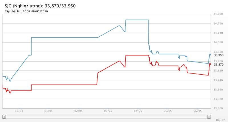 Cụ thể, đến thời điểm 10h41’ sáng nay, giá vàng miếng SJC của Công ty TNHH Một thành viên Vàng bạc đá quý Sài Gòn (SJC) đang đứng ở 33,80 - 34,00 triệu đồng/lượng (MV-BR), tăng 60 nghìn đồng so với chốt phiên trước đó.