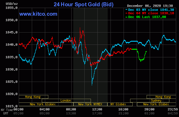 Trên Kitco.com, tại thời điểm 7h30 sáng ngày hôm nay 7/12 (theo giờ Việt Nam), giá vàng giao ngay được giao dịch ở mức 1.837 USD/ounce. Giá vàng giao tháng 12/2021 trên sàn Comex New York được giao dịch ở mức 1.853,4 USD/ounce.