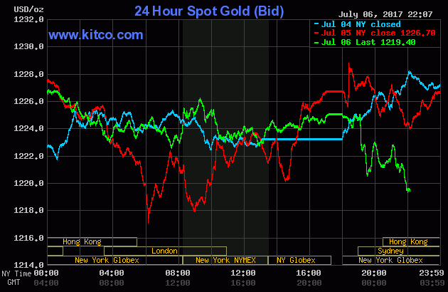 Chốt phiên giao dịch Thứ Năm (ngày 6/7), giá vàng giao tháng Tám trên sàn Comex tại Sở Giao dịch New York Mercantile tăng $1,60 (+0,1%) lên chốt tại $1.223,30/oz. Tương tự, giá bạc giao tháng Chín vẫn tăng 8,7 cents (+0,6%) lên $15,983/oz.
