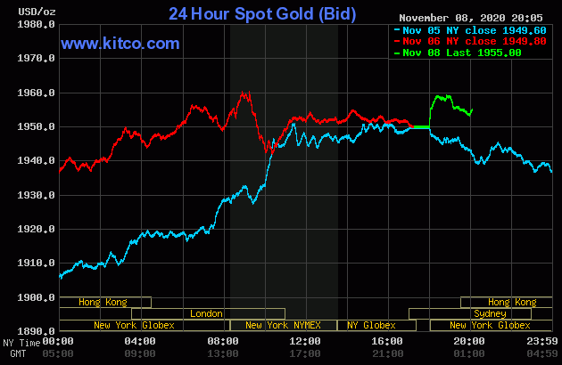 Trên Kitco.com, tại thời điểm 8h sáng ngày hôm nay 9/11 (theo giờ Việt Nam), giá vàng giao ngay được giao dịch ở mức 1.955 USD/ounce, tăng hơn 5 USD/ounce so với giá kết phiên giao dịch gần nhất. Giá vàng giao tháng 12/2020 trên sàn Comex New York cũng được giao dịch ở mức 1.955 USD/ounce.