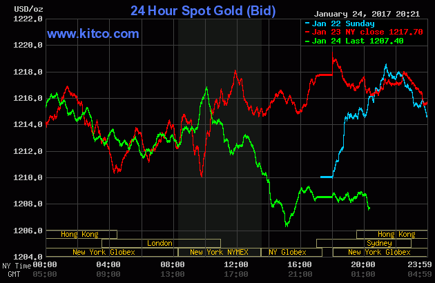 Chốt phiên giao dịch cuối Thứ Ba (ngày 24/1/2017), giá vàng giao tháng Hai trên sàn Comex tại Sở Giao dịch New York Mercantile giảm $4,80 (-0,4%) xuống chốt tại $1.210,80/oz. Trước đó, phiên Thứ Hai đầu tuần, vàng đã bật mạnh 0,9% lên $1.215,60/oz – cao nhất kể từ 17/11, căn cứ theo dữ liệu của FactSet.