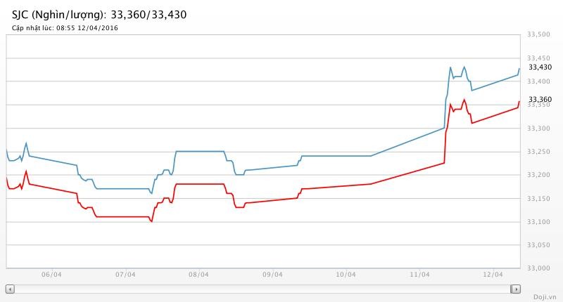 Tương tự, tại các đại lý Doji, giá vàng miếng SJC cũng được Tập đoàn điều chỉnh tăng 50 nghìn đồng lên yết ở 33,36 – 33,43 triệu đồng/lượng (MV-BR) đối với giao dịch lẻ; và đắt hơn 10 nghìn đồng chiều mua, đồng thời rẻ hơn 10 nghìn đồng chiều bán đối với giao dịch buôn ở thị trường Hà Nội. Với biểu giá này, doãng chênh lệch 2 chiều mua – bán vàng SJC tại Doji hiện là 70 nghìn đồng/lượng.