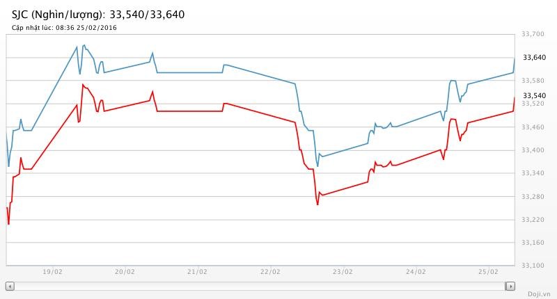Tương tự, tại Doji, giá vàng miếng SJC cũng được Tập đoàn điều chỉnh tăng 70 nghìn đồng mỗi lượng lên yết ở 33,54 – 33,64 triệu đồng/lượng (MV-BR) đối với giao dịch lẻ; và đắt hơn 10 nghìn đồng chiều mua, đồng thời rẻ hơn 10 nghìn đồng chiều bán đối với giao dịch buôn ở thị trường Hà Nội. Hiện, doãng chênh lệch 2 chiều mua-bán ở Doji vẫn là 100 nghìn đồng/lượng.