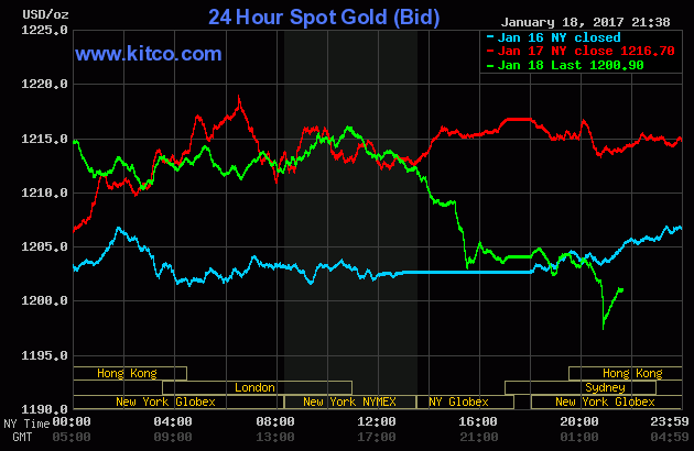 Chốt phiên giao dịch Thứ Tư (ngày 18/1/2017), giá vàng giao Tháng Hai trên sàn Comex tại Sở giao dịch New York Mercantile khẽ trôi 80 cents (-0,1%) về đóng cửa ở $1.212,10/oz. Trước đó, phiên Thứ Ba, giá vàng đã tăng sốc tới 1,4% - mạnh nhất kể từ ngày 17/11, căn cứ theo dữ liệu của FactSet.