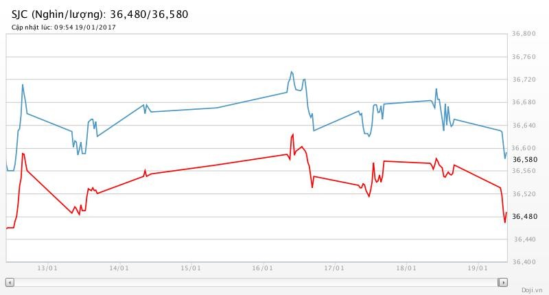Tương tự, tại các đại lý của Doji, giá vàng miếng SJC cũng được tập đoàn này điều chỉnh giảm 90 nghìn đồng chiều mua và 70 nghìn đồng chiều bán về 36,48 – 36,58 triệu đồng/lượng (MV-BR) đối với giao dịch lẻ; và đắt hơn 10 nghìn đồng chiều mua, đồng thời rẻ hơn 10 nghìn đồng chiều bán đối với giao dịch buôn ở thị trường Hà Nội. Hiện, doãng chênh lệch 2 chiều mua - bán ở Doji là 100 nghìn đồng/lượng.