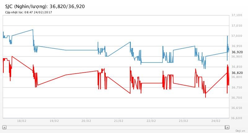 Tương tự, tại các đại lý của Doji, giá vàng miếng SJC cũng được tập đoàn này điều chỉnh tăng 100 nghìn đồng chiều mua và 20 nghìn đồng chiều bán lên yết ở 36,82 – 36,92 triệu đồng/lượng (MV-BR) đối với giao dịch lẻ; và đắt hơn 10 nghìn đồng chiều mua, đồng thời rẻ hơn 10 nghìn đồng chiều bán đối với giao dịch buôn ở thị trường Hà Nội. Theo đó, doãng chênh lệch 2 chiều mua - bán ở Doji đang là 100 nghìn đồng/lượng.