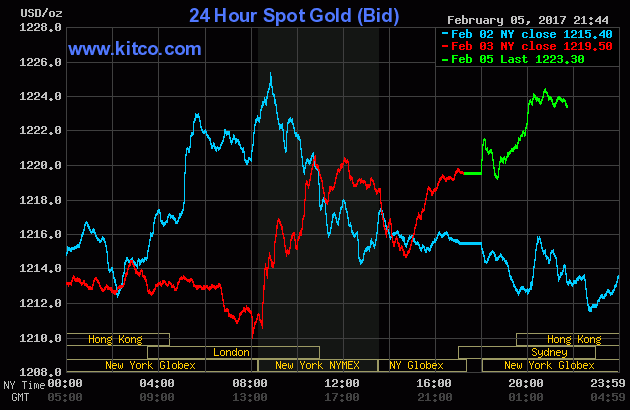 Chốt phiên giao dịch cuối tuần trước (Thứ Sáu ngày 3/2/2017), giá vàng giao tháng Tư trên sàn Comex tại Sở Giao dịch New York Mercantile nhích nhẹ $1,40 (+0,1%) lên chốt tại $1.220,80/oz. Như vậy, tính chung trong tuần, vàng đã tăng giá tổng cộng 2,4% - mạnh nhất kể từ tuần kết thúc vào ngày 10/6/2016.
