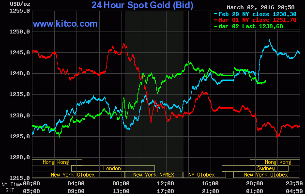 Chốt phiên giao dịch Thứ Tư (ngày 02/03), giá vàng giao tháng Tư trên sàn Comex tại Sở giao dịch New York Mercantile đảo chiều bật mạnh $11 (+0,9%) lên đóng cửa ở $1.241,80/oz, đoạt đỉnh kể từ ngày 11/02, theo số liệu của FactSet.