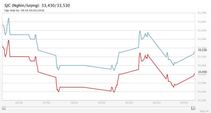 Tính đến thời 9h14’ sáng, Công ty TNHH Một thành viên Vàng bạc đá quý Sài Gòn (SJC) đang yết giá vàng miếng SJC ở 33,29 - 33,59 triệu đồng/lượng (MV-BR), tăng 50 nghìn đồng so với chốt phiên trước đó.