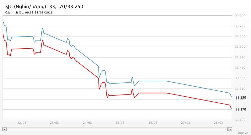 Cụ thể, tính đến thời 9h49’, Công ty TNHH Một thành viên Vàng bạc đá quý Sài Gòn (SJC) đang yết giá vàng miếng SJC ở 33,04 - 33,29 triệu đồng/lượng (MV-BR), giảm 110 nghìn đồng chiều mua và 130 nghìn đồng chiều bán so với chốt phiên trước đó.