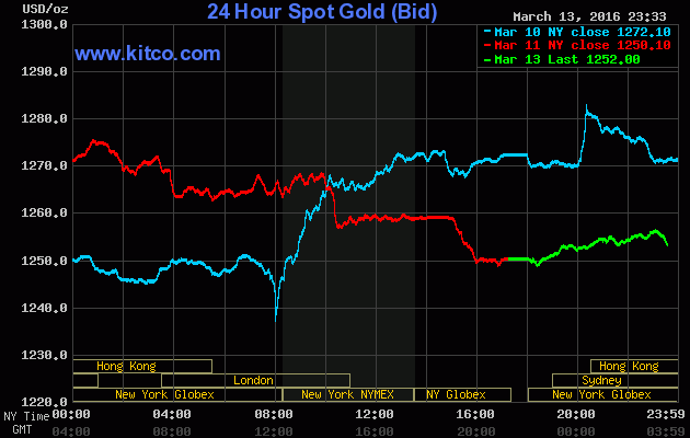Chốt phiên giao dịch cuối tuần trước (Thứ Sáu ngày 11/03), giá vàng giao tháng Tư trên sàn Comex tại Sở giao dịch New York Mercantile giảm mạnh $13,40 (-1,1%) xuống đóng cửa ở $1.259,40/oz, tương ứng giảm tổng cộng 0,9% trong cả tuần.
