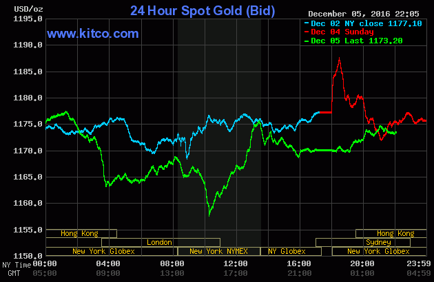 Chốt phiên giao dịch đầu tuần (Thứ Hai ngày 5/12), giá vàng giao Tháng Hai trên sàn Comex tại Sở giao dịch New York Mercantile khẽ giảm $1,30 (-0,1%) xuống đóng cửa ở $1.176,50/oz. Trước đó trong phiên, thậm chí đã có những thời điểm giá kim loại quý này còn rơi xuống mức $1.158,60/oz.