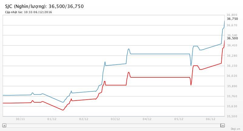 Tương tự, tại các đại lý của Doji, giá vàng miếng SJC lại được Tập đoàn điều chỉnh tăng mạnh 400 nghìn đồng mỗi chiều lên yết ở 36,48 – 36,73 triệu đồng/lượng (MV-BR) đối với giao dịch lẻ; và đắt hơn 10 nghìn đồng chiều mua, đồng thời rẻ hơn 10 nghìn đồng chiều bán đối với giao dịch buôn ở thị trường Hà Nội. Hiện, doãng chênh lệch 2 chiều mua - bán ở Doji là 250 nghìn đồng/lượng.