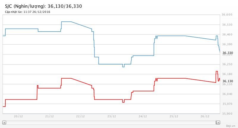 Tương tự, tại các đại lý của Doji, giá vàng miếng SJC cũng được Tập đoàn này điều chỉnh hạ 20 nghìn đồng về niêm yết ở mức 36,13 – 36,33 triệu đồng/lượng (MV-BR) đối với giao dịch lẻ; và đắt hơn 10 nghìn đồng chiều mua, đồng thời rẻ hơn 10 nghìn đồng chiều bán đối với giao dịch buôn ở thị trường Hà Nội. Hiện, doãng chênh lệch 2 chiều mua - bán ở Doji là 200 nghìn đồng/lượng.