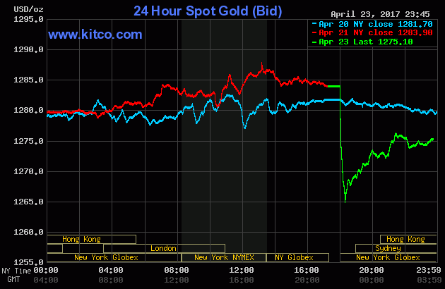 Sau kết quả bầu cử sơ bộ, ông Emmanuel Macron, ứng viên ôn hòa, và bà Marine Le Pen, lãnh đạo phe cực hữu, là hai gương mặt sẽ bước tiếp vào vòng hai bầu cử tổng thống Pháp đầu tiên. Kết quả này khiến thị trường lo ngại Pháp sẽ tiếp tục diễn ra cuộc Frexit rời khỏi khu vực chung châu Âu.Sau thông tin này, giá vàng bất ngờ lao dốc mạnh.