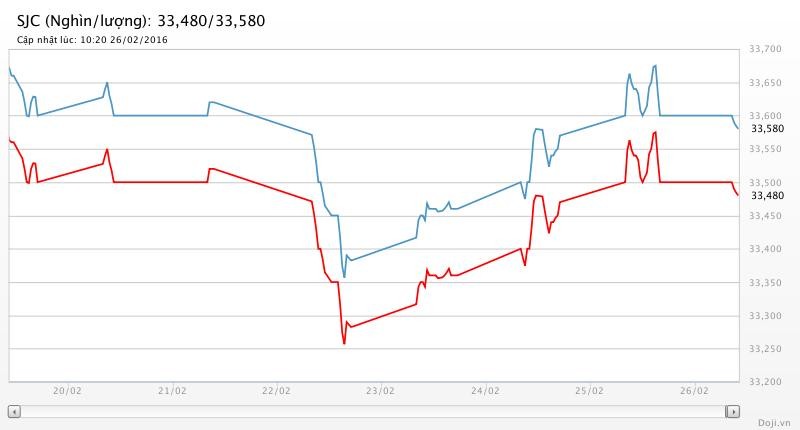 Tương tự, tại Doji, giá vàng miếng SJC cũng được Tập đoàn điều chỉnh giảm 20 nghìn đồng mỗi lượng xuống yết ở 33,48 – 33,58 triệu đồng/lượng (MV-BR) đối với giao dịch lẻ; và đắt hơn 10 nghìn đồng chiều mua, đồng thời rẻ hơn 10 nghìn đồng chiều bán đối với giao dịch buôn ở thị trường Hà Nội. Hiện, doãng chênh lệch 2 chiều mua-bán ở Doji vẫn là 100 nghìn đồng/lượng.