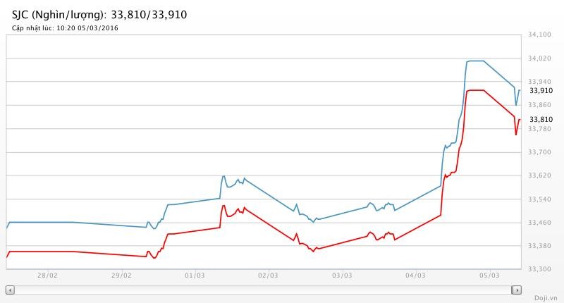 Với biểu giá trên, tính ra giá vàng SJC Việt Nam hiện đang cao hơn giá vàng thế giới khoảng 40 nghìn đồng mỗi lượng. Trước đó, trong hôm qua 4/3, lần đầu tiên sau hơn 5 năm, giá vàng thế giới mới lại thấp hơn giá quốc tế, với khoảng cách khoảng 220 nghìn đồng mỗi lượng (chưa tính thuế và chi phí gia công).