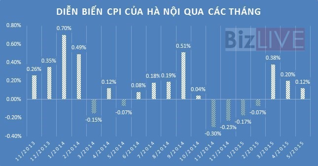 Cục Thống kê TP Hà Nội vừa công bố chỉ số giá tiêu dùng (CPI) tháng 5/2015. Theo đó, CPI TP Hà Nội tháng này tiếp tục tăng 0,12% , CPI TP.HCM cũng tăng 0,74% so với tháng trước.