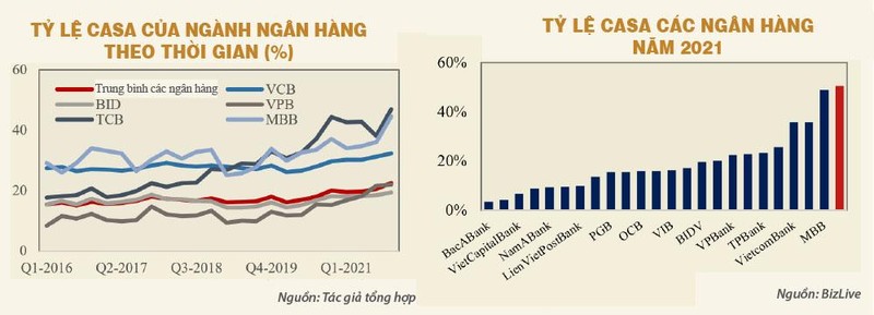 Truyền thông trong những năm gần đây đã liên tục đưa tin về mức tăng trưởng CASA vượt trội của các ngân hàng thương mại, tuy nhiên thực tế trong hơn sáu năm qua thì mức CASA trung bình của hệ thống ngân hàng chỉ tăng từ 15% lên 22%. Điều đó cho thấy mức tăng trưởng CASA cao chỉ diễn ra ở một số ngân hàng. Biểu đồ bên dưới cho thấy có một sự phân hóa lớn trong tỷ lệ CASA của các ngân hàng thương mại. Một số ngân hàng như TCB, MBB hay VCB có tỷ lệ CASA lên đến từ 45-50% nhưng cũng có nhiều nhiều ngân hàng chỉ dưới 10%.