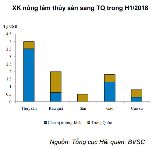 Theo số liệu của Tổng cục Hải Quan, tổng kim ngạch xuất khẩu nhóm hàng nông lâm thủy sản trong 6 tháng đầu năm 2018 đạt khoảng 12,7 tỷ USD, thị trường Trung Quốc chiếm tỷ trọng 27%. Trong đó một số mặt hàng nổi bật là: cao su (0,8 tỷ USD, tương đương tỷ trọng 63%); sắn (0,5 tỷ USD tương đương 100%); gạo (0,5 tỷ USD, tương đương 28%)...