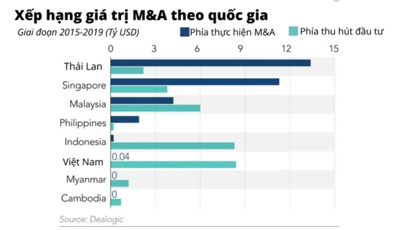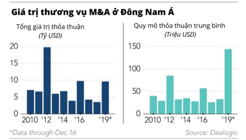 Theo dữ liệu của Dealgonic, các thương vụ sáp nhập và mua lại (M&A) ở khu vực Đông Nam Á được dẫn dắt bởi các công ty đến từ các nền kinh tế tiên tiến hơn. Trong đó, người mua từ Thái Lan chiếm 38% giá trị các giao dịch trong giai đoạn 2010-2019, tiếp theo là Singapore với 32% và Malaysia với 23%.