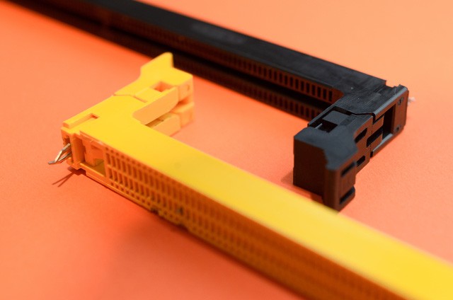 Đầu tiên, chính là khe cắm RAM. Đây là chỗ dễ nhận ra nhất, có chiều dài đúng bằng một thanh RAM và có 2 khớp ở 2 đầu giữ giữ RAM nằm chặt trên bo mạch. Các mainboard hiện nay thường có từ 4 khe cắm RAM với các sản phẩm phổ thông, và 8 khe cắm RAM với các mainboard cao cấp, mainboard máy chủ. Khe cắm RAM làm chủ yếu từ nhựa và thường có màu sắc trùng với màu chủ đạo trên bo mạch, trên Z97WE chúng ta có thể thấy được 2 khe cắm RAM màu vàng, và 2 khe cắm có màu đen.