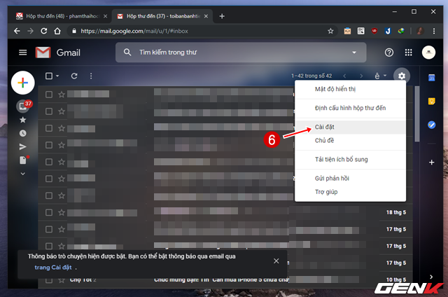Bước 3: Giờ bạn hãy truy cập vào hộp thư Gmail mới và bạn hãy nhấp vào biểu tượng hình bánh răng, chọn "Cài đặt".