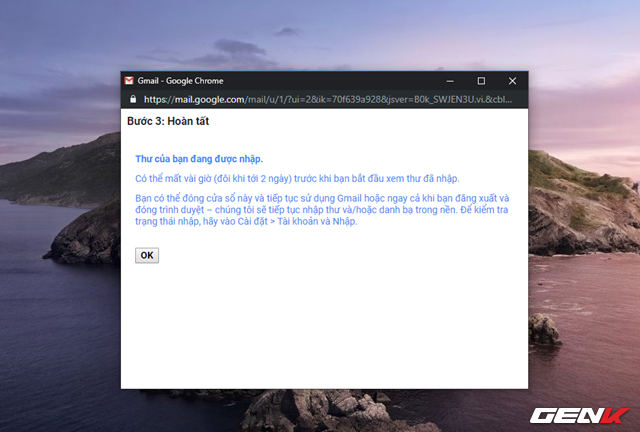 Khi đã hoàn tất kết nối, bạn hãy đánh dấu vào các mục mình cần và nhấn OK. Quá trình chuyển mail có thể mất vài giờ hoặc 02 ngày tùy theo số lượng mail.