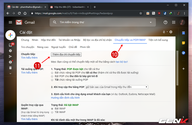 Bước 5: Cuối cùng, hãy quay trở lại trang cài đặt của tài khoản Gmail cũ và nhấp vào "Thêm địa chỉ chuyển tiếp" ở mục Chuyển tiếp của Chuyển tiếp và POP/IMAP.