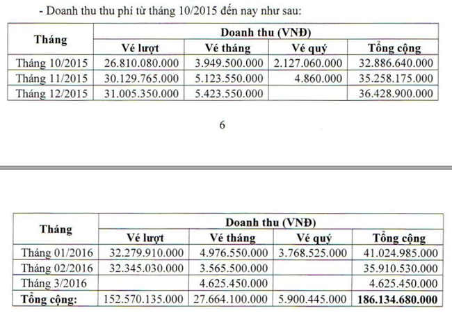 Trước đó, theo báo cáo số 276/BC-PVCG ngày 22/3/2016 của công ty BOT Pháp Vân- Cầu Giẽ về tình hình thực hiện dự án chuyển tới các cổ đông thì doanh thu trong 6 tháng (từ tháng 10/2015 đến tháng 3/2016) của công ty này là 186.134.680.000 đồng. Trong đó, số liệu tháng 3 chưa cập nhật doanh thu vé lượt.