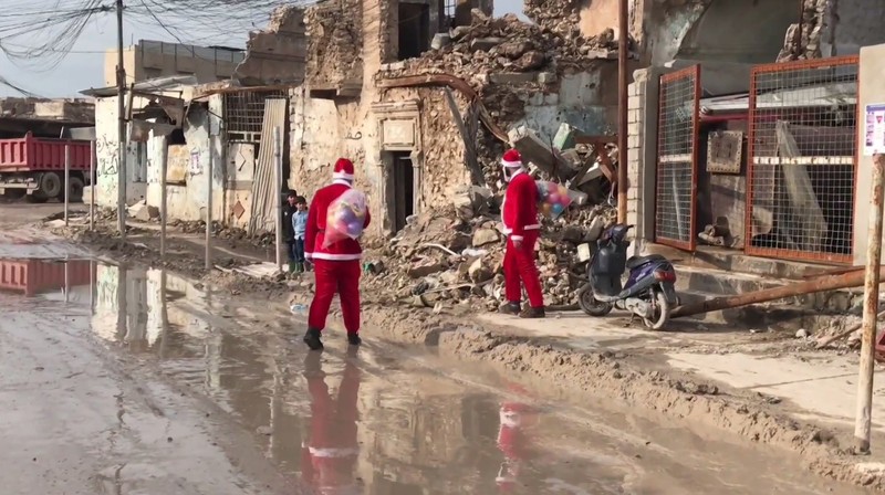 Hai người Iraq trong vai ông già Noel mang túi với những món quà nhỏ đầy màu sắc, đến thành phố cổ Mosul để trao những niềm vui nhỏ cho trẻ em địa phương, phải chịu vô vàn đau khổ trong thời kỳ Nhà nước Hồi giáo tự xưng (IS) áp đặt chế độ khủng bố hà khắc trong thành phố cách đây một năm rưỡi.