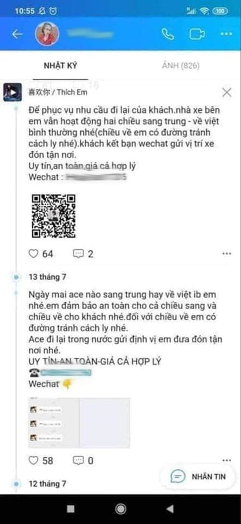 Còn trên Zalo, một người có nick là V*** quảng cáo: “Để phục vụ nhu cầu đi lại của khách, nhà xe bên em vẫn hoạt động hai chiều sang Trung về Việt bình thường nhé. Chiều về em có đường tránh cách ly nhé. Khách kết bạn Wechat gửi vị trí xe đón tận nơi”.