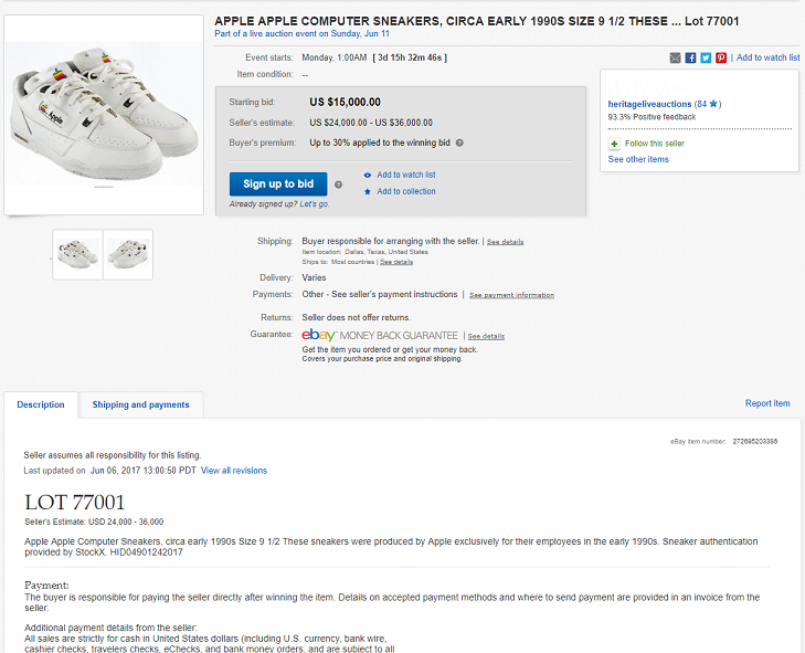 Cuộc đấu giá sẽ bắt đầu vào ngày 11/6 tới trên eBay với giá khởi điểm là 15 ngàn USD (gần 340 triệu đồng), giá trị thực của giày Apple mà Heritage Auctions dự đoán vào khoảng 24 ngàn đến 36 ngàn USD (hơn 540 triệu đến hơn 810 triệu đồng).