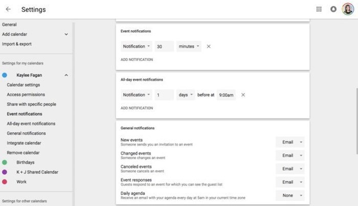 Cả Google Calendar và Apple Calendar đều có tùy chọn thông báo tới người dùng về sự kiện sắp đến giờ, bao gồm qua email hoặc thông báo điện thoại. Tuy nhiên, Google cho phép thiết lập notification 1 lần duy nhất cho tất cả các sự kiện người lên lịch trong tương lai. Còn với phiên bản của Apple, gần như mỗi sự kiện thêm vào đều phải cài đặt thêm thông báo, rất mất thời gian.