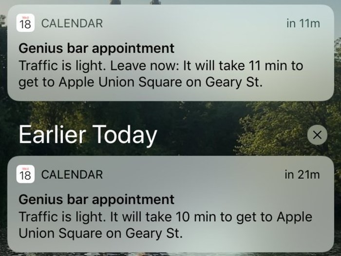 Tuy nhiên, Apple còn cung cấp tính năng “time to leave” độc đáo mà Google không có. Về cơ bản, thiết bị sẽ tính toán giao thông trên tuyến đường sắp diễn ra cuộc hẹn tiếp theo của bạn, sau đó thông báo bạn về thời gian bạn nên xuất phát đi để phòng tắc đường.