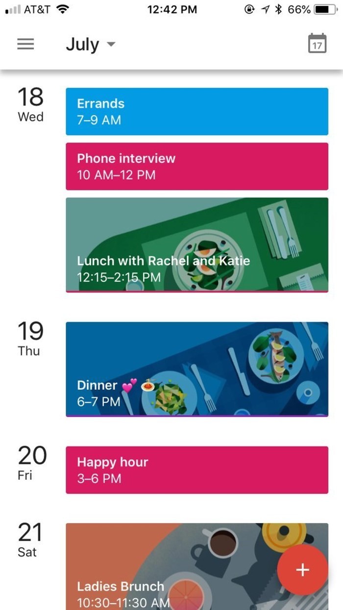 Một ứng dụng lịch tốt phải đơn giản, dễ sử dụng nhất có thể. Thiết kế sặc sỡ, thoáng đãng, tách bạch của Google Calendar khiến ngay cả những ngày làm việc bận rộn với lịch trình dày đặc nhất cũng trở nên ngăn nắp và dễ đọc, cho phép người dùng chỉ cần lướt qua là đã có thể nắm bắt được lịch trình công việc. Đặc biệt còn có chức năng “schedule view” cho phép hiển thị toàn bộ các cuộc hẹn sắp tới theo dạng danh sách dài, bắt mắt được sắp xếp theo ngày. Ngoài ra, nhờ có AI, giải pháp lịch của Google sẽ tự trang trí hình nền sự kiện dựa trên tên sự kiện.