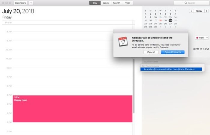 Apple Calendar dù cho phép mời người khác vào sự kiện, nhưng lại không cho phép mời bất cứ ai chưa có email trong danh bạ của bạn. Trong ví dụ dưới dây, dù iOS phát hiện ra địa chỉ email từ ứng dụng Inbox, Calendar vẫn không cho phép người dùng gửi lời mời tham gia và yêu cầu phải thêm danh bạ trước một cách thủ công.