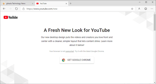 Nếu bạn vào địa chỉ "https://www.youtube.com/new" bằng Microsoft Edge, bạn sẽ nhận được một thông điệp rằng "trình duyệt của bạn không được hỗ trợ". Tiếp theo thông điệp này là một thông điệp khác, kêu gọi bạn tải về trình duyệt Chrome. Bởi chẳng có bất kỳ lời giải thích cụ thể tại sao Edge lại không hỗ trợ giao diện YouTube mới, trong khi trình duyệt Edge cổ điển trước đây và các trình duyệt khác lại hỗ trợ, nhiều người dùng hẳn sẽ chuyển sang Google Chrome nếu trình duyệt này chưa được cài sẵn trong máy.